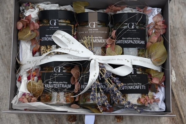 Das Päckli ist von uns hübsch verpackt mit dem Inhalt gemäss Foto, kommt im Gartenfenster Böxli, gut gepolstert zu dir nach Hause, damit Du Freude verschenken kannst.