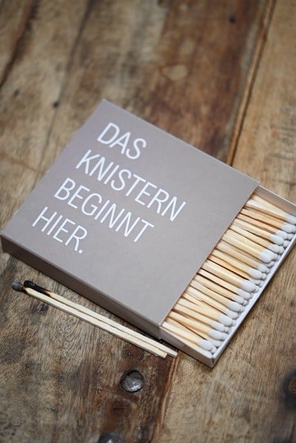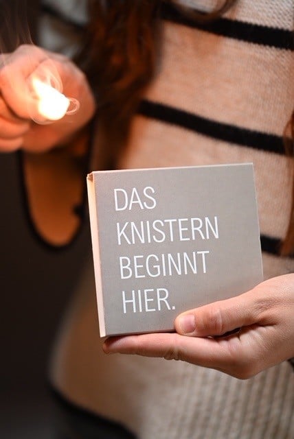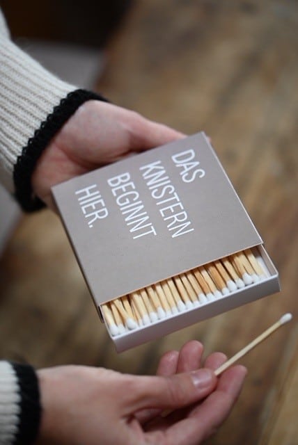 „Das Knistern beginnt hier“ …. so dürfen die Zundhölzer gerne im Wohnzimmer liegen bleiben.